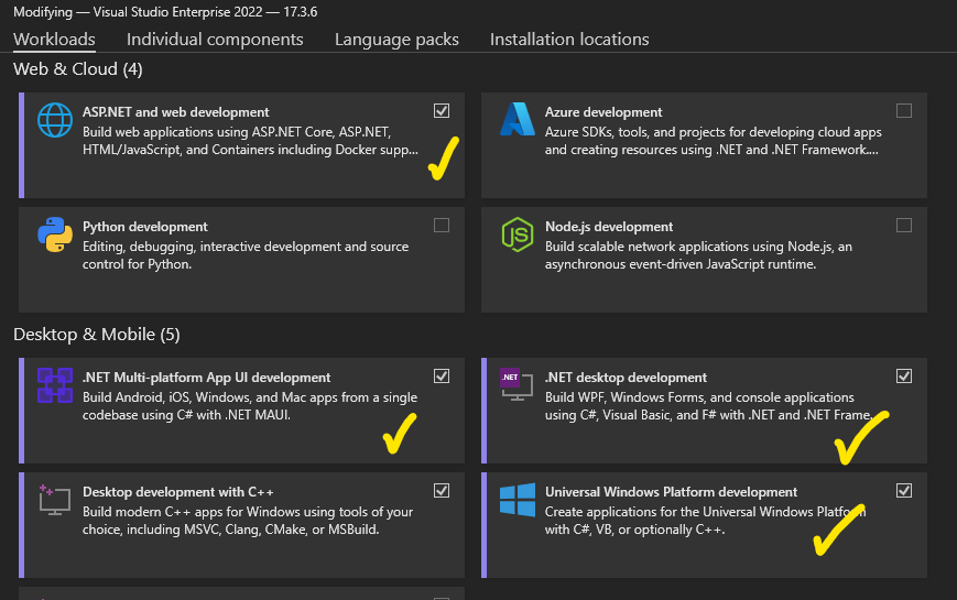 From indvidual components tab make sure Windows SDK 10.0.22000 and 10.0.18362 are installed