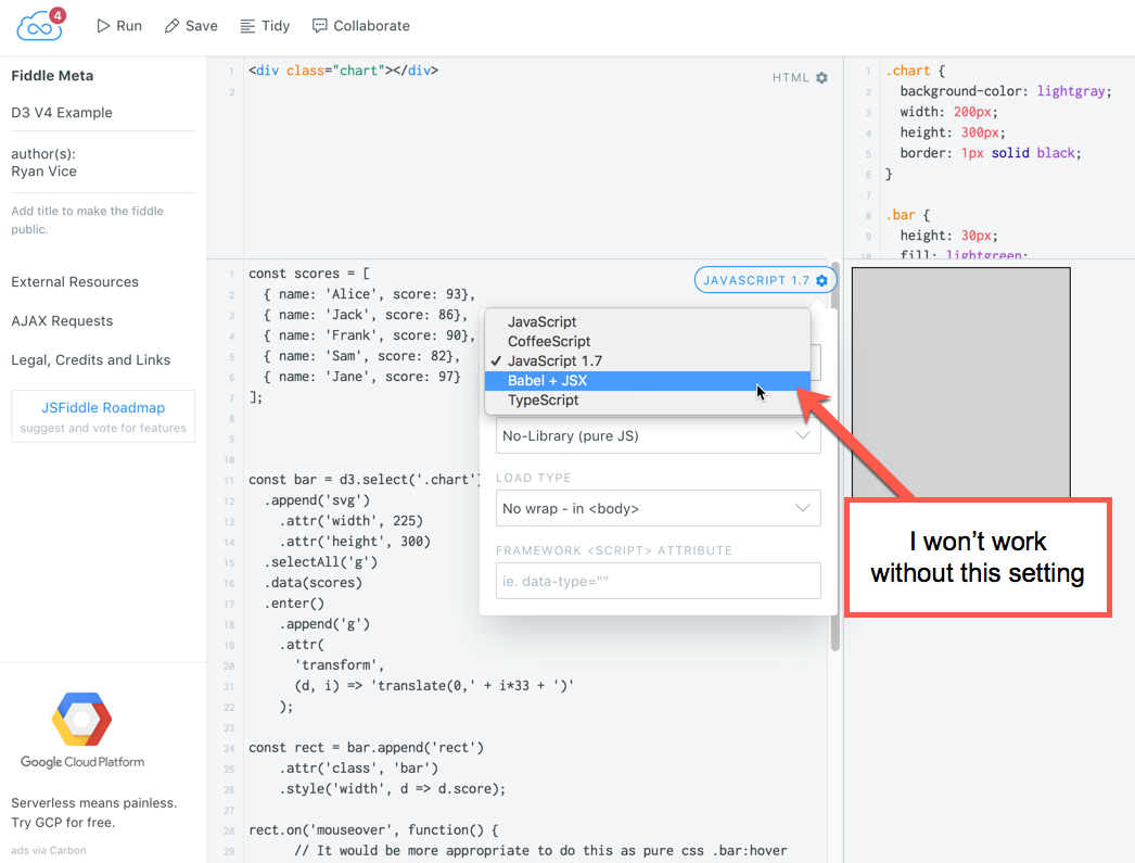 I tried to configure the manifest to use Babel but I'm not sure that it worked and there's a latency from when you make changes to when you see them in the JsFiddles so please make sure that JS is set to Babel as shown below or it won't work.