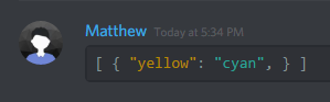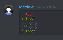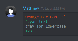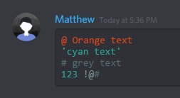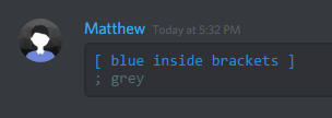 Discord also supports code blocks as well. You can make your own code blocks by wrapping your text in backticks (`)