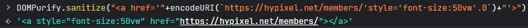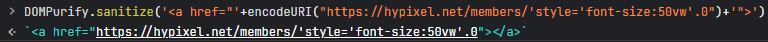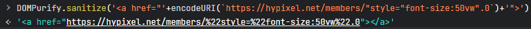 It's possible to inject new attributes that DOMPurify considers "safe" by default in the anchor tag due to insufficient/improper encoding/escaping of the user's hypixel button.
