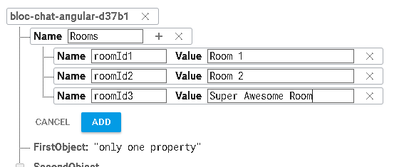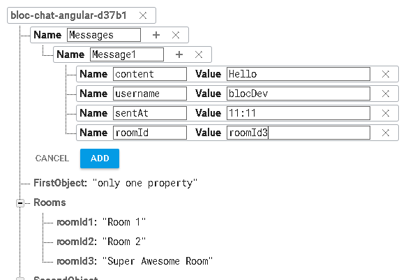 We set the value of the message's roomId property equal to the ID of one of our rooms. I chose the Super Awesome Room, roomId3. I called my test message Message1, but like the Rooms, they will receive random names when generated from code. You can add multiple messages if you'd like: