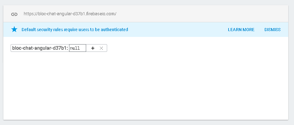 If you see that warning, "Default security rules require users to be authenticated," you will have to update your database's security rules to allow updates. Go to the Rules tab. The default rules probably look like this: