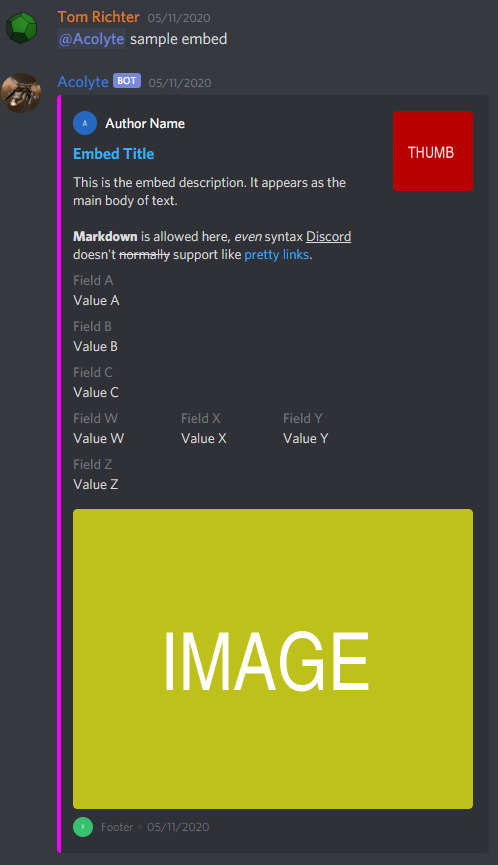| .WithDescription("This is the embed description. It appears as the main body of text.\n\n**Markdown** is allowed here, *even* syntax __Discord__ doesn't ~~normally~~ support like [pretty links](https://example.com/).") | |