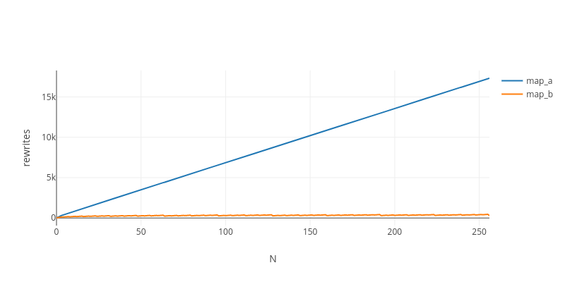 Here, we once again defined it in two different ways: map_b fuses and map_a doesn’t. Let’s measure the complexity of applying map repeatedly to a list: