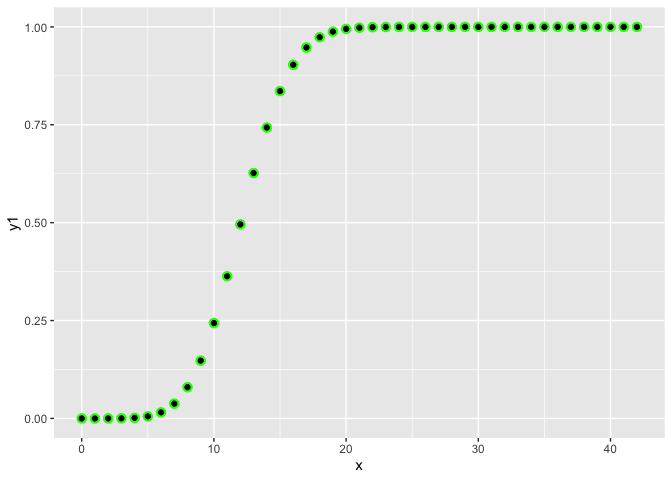 geom_point(aes(y = y2))# that makes a lot of sense! as the number of successes increases (in a
