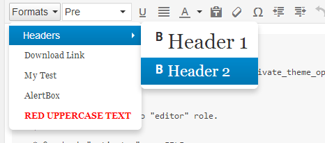 var defaultStyleFormats = [ {title: 'Headers', items: [ {title: 'Header 1', format: 'h1'}, {title: 'Header 2', format: 'h2'}, {title: 'Header 3', format: 'h3'}, {title: 'Header 4', format: 'h4'}, {title: 'Header 5', format: 'h5'}, {title: 'Header 6', format: 'h6'} ]},