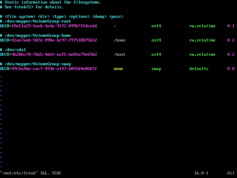 | | | /dev/VolumeGroup/swap | /dev/VolumeGroup/root | /dev/VolumeGroup/home |
