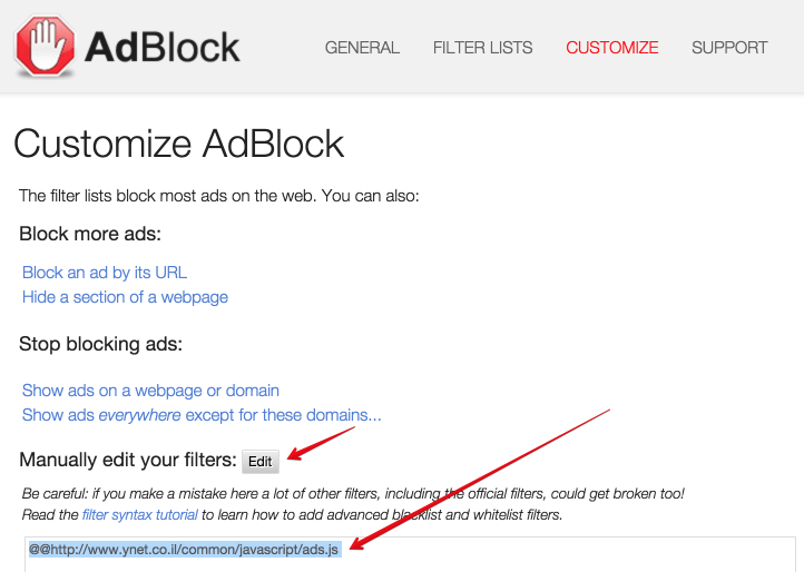 • Click on Edit and add: @@http://www.ynet.co.il/common/javascript/ads.js. Should look like: Popup Blocker Settings