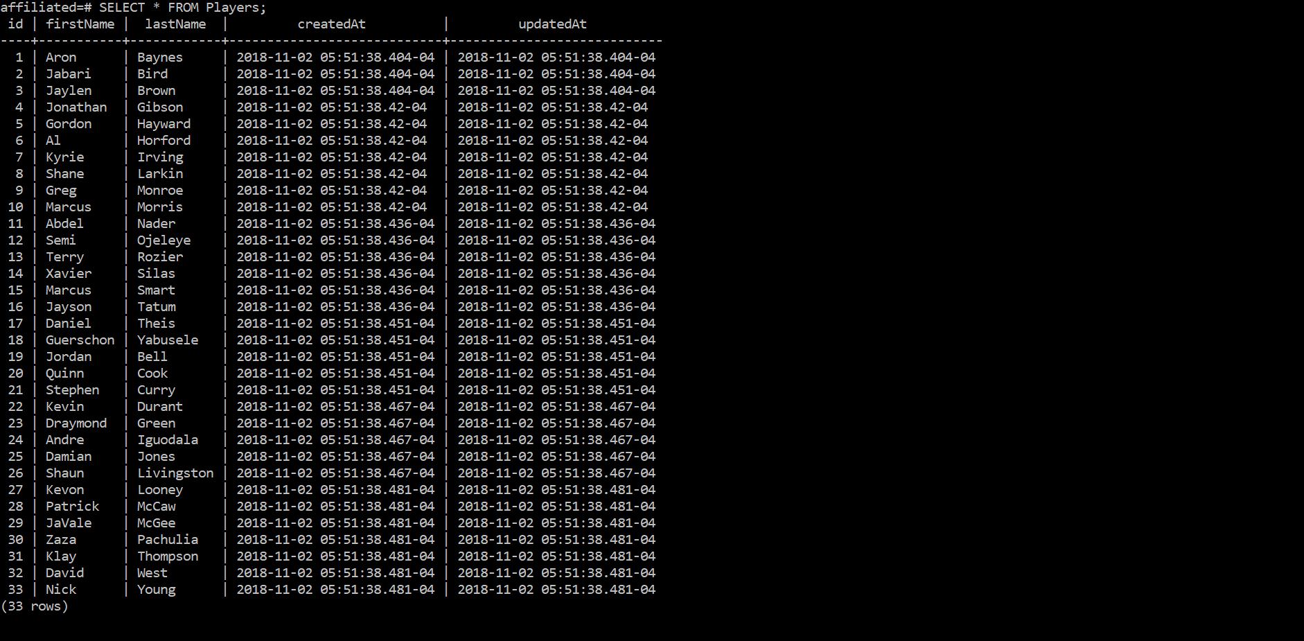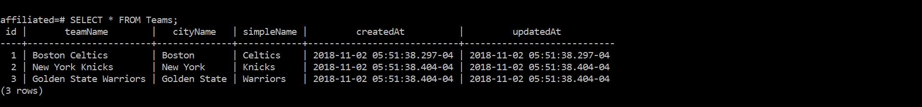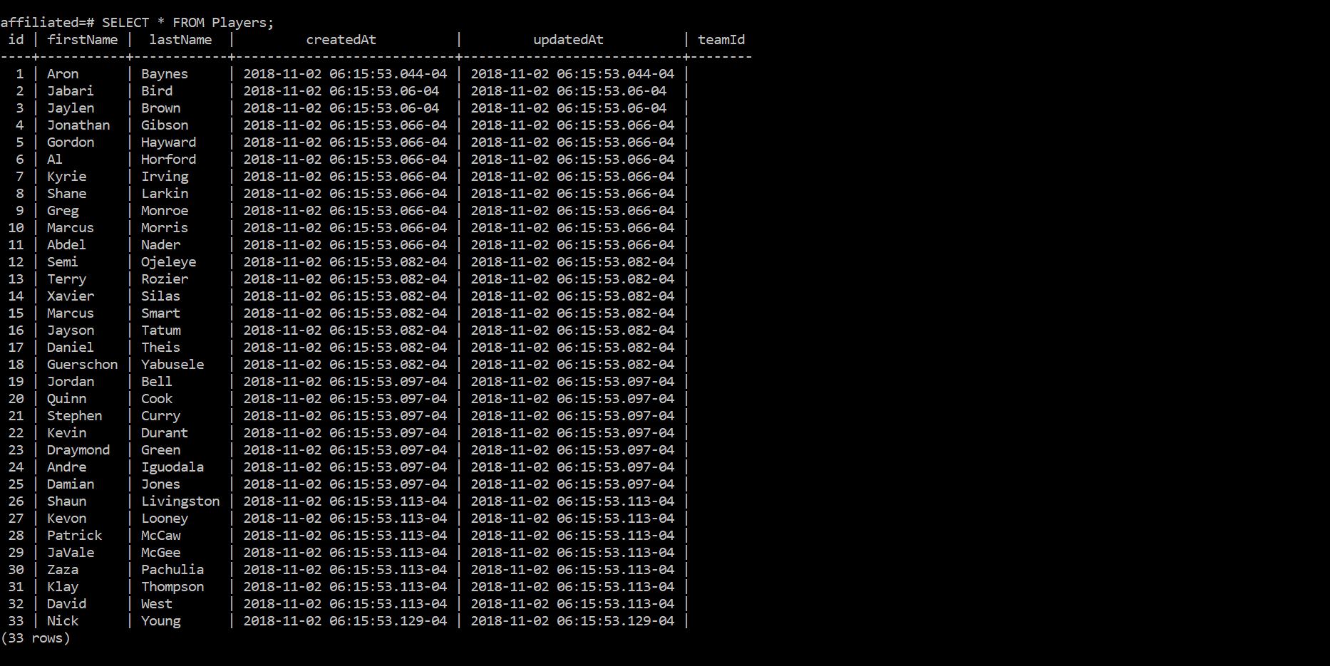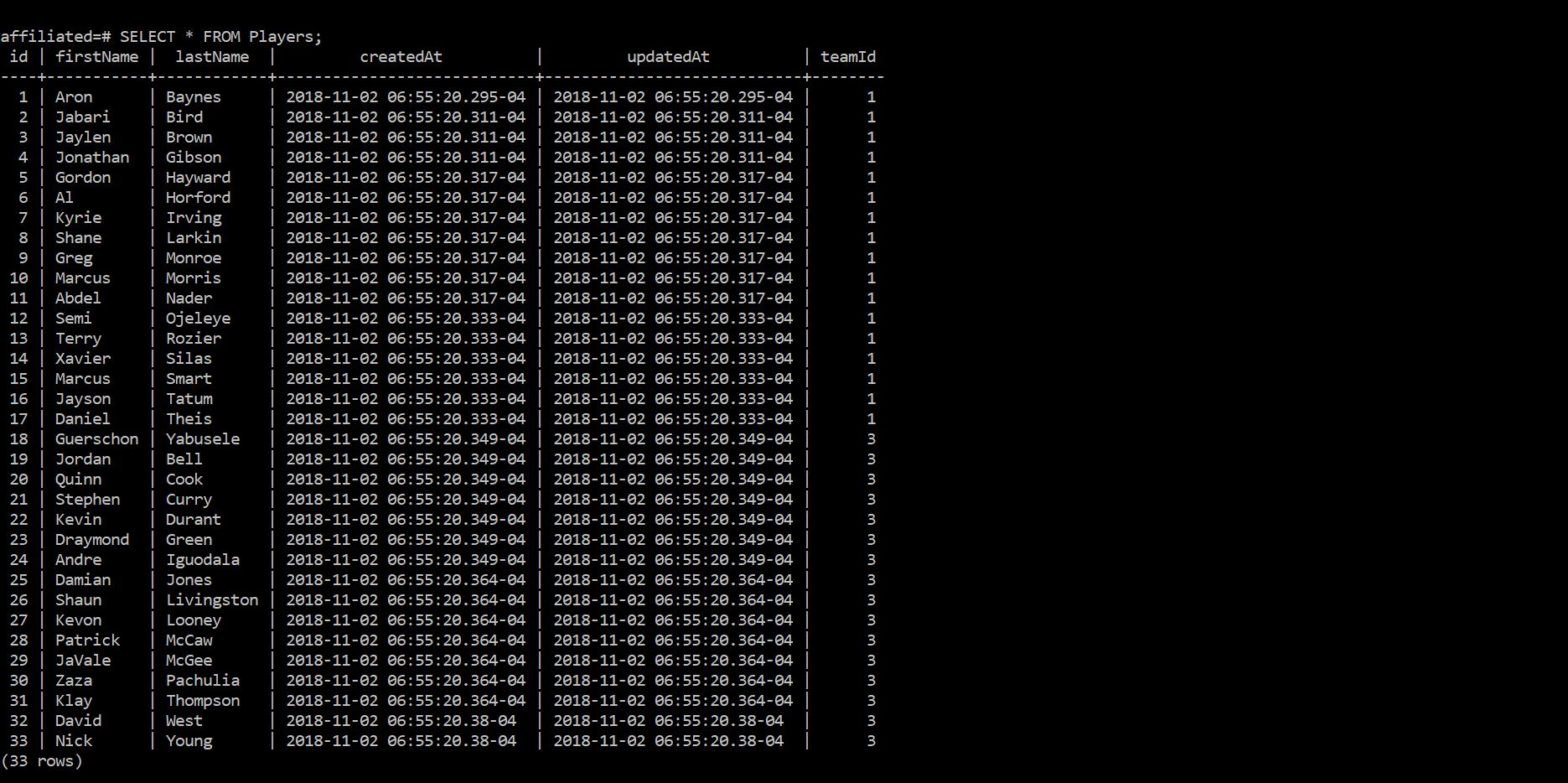 To get back on track, let's run the seed script again, except this time, we'll assign teamIds to players. As a heads-up, for this example, the first 17 players will be assigned a teamId of 1 and the remaining 16 players will be assigned a teamId of 3.