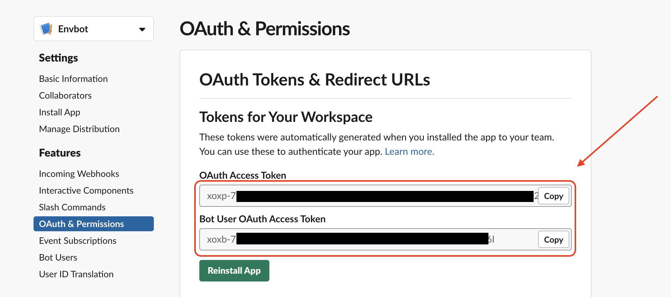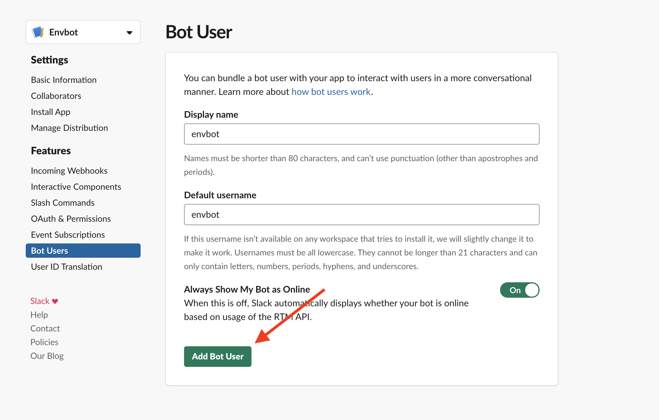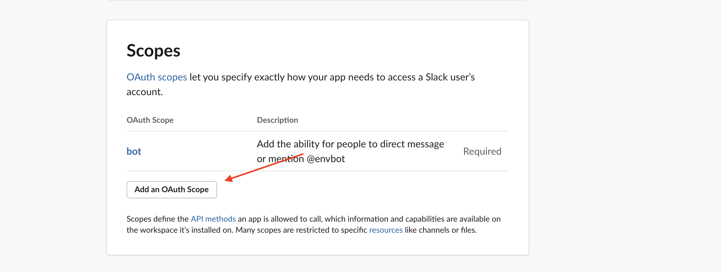 Visit Slack's API landing page Click to create a new app Specify a Name & Create the App Add the Bots feature to the App Add a Bot User Save The Bot User Add Required Permission Scopes Specify the files:read scope Install the App to Your Workspace Confirm installation Get your keys