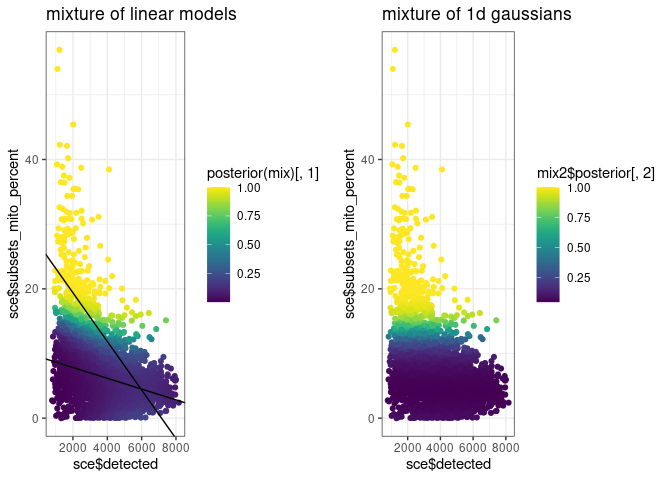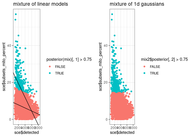 mix <- flexmix(subsets_mito_percent ~ detected, data = colData(sce), k = 2)
