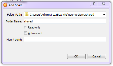 sharedfor the Folder Name. Make sure that Read-only and Auto-mount are unchecked and Mount point is blank. Then click OK. -