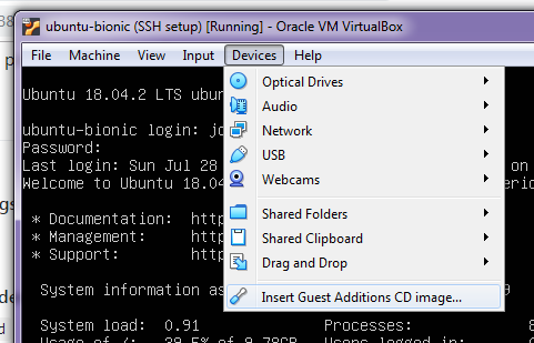 Once your VM is up and running, go to Devices -> Insert Guest Additions CD image