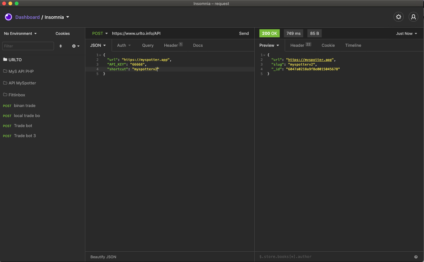 curl --location --request POST 'https://www.urlto.info/API' \ --header 'Content-Type: application/json' \ --header 'Cookie: __cfduid=d7dd64f3b426ab463f74a31dbdd556a4f1615305473' \ --data-raw '{ "url": "https://www.myspotter.app", "API_KEY": "66666", "shortcut": "myspotter" }'