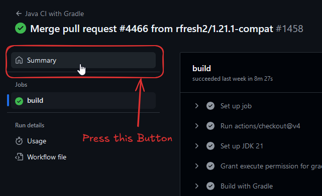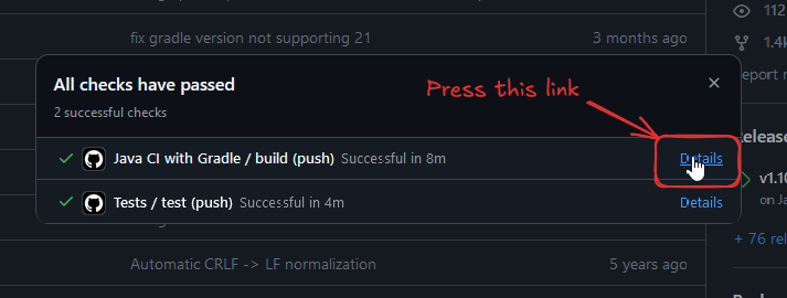 - This will bring up another UI. Press this link (next to the text that says "Java CI with Gradle / build (push)"):