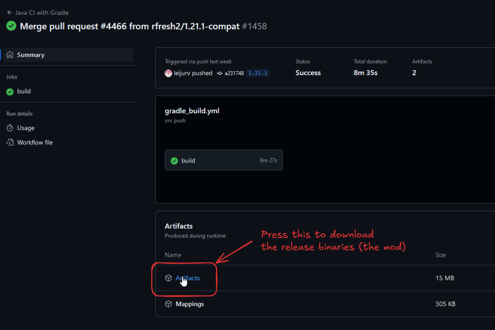 - Now, press the "Artifacts" button to download the mod: