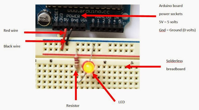 - In wiring, the colour red conventionally means positive, and this wire is going from the 5V power socket on the Arudino to the positive rail.