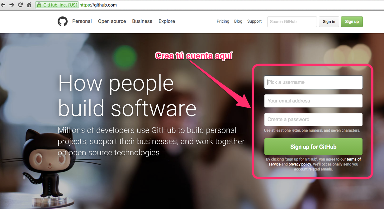 Para crear nuestra cuenta ingresamos a la siguiente url: https://github.com/ y completamos los datos del registro recuerda que debes usar el mismo correo que usaste para configurar GIT en tu equipo.