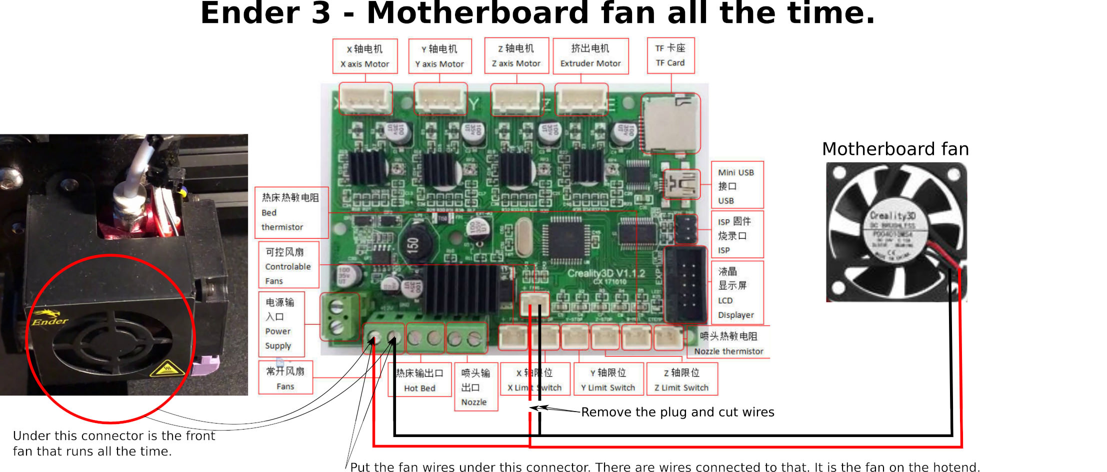 🔧 Alternatively, hook up your fan(s) to a direct output on the power supply. There are three connections free in total on the Ender 3 you can use for auxiliary purposes (and these are all on the same 24V rail with plenty of amps to spare).