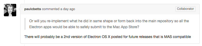 There will probably be a 2nd version of Electron OS X posted for future releases that is MAS compatible