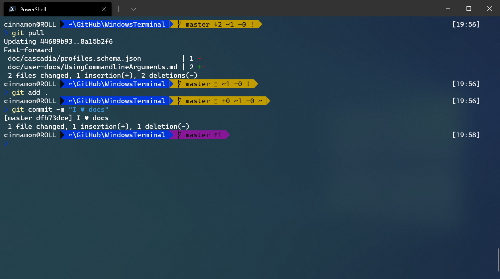 Git status information:Posh-Gitadds Git status information to your prompt as well as tab-completion for Git commands, parameters, remotes, and branch names.Theme:Oh-My-Poshprovides theme capabilities for your PowerShell prompt. Oh-My-Posh comes with several built-in themes.History and History Based Prediction: Predictive IntelliSense is implemented in the PowerShell engine and presented through the PSReadLine module.Key Bindings for Predictions: Key bindings control cursor movement and additional features within the prediction. When you type a character the prediction suggestes you last command started with typed character(s). by using Up/Down Arrows you can switch between commands with same start-characters.