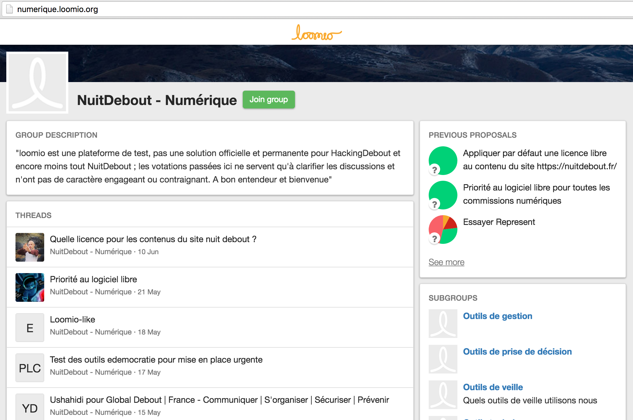 I can show you how the Numérique Commission in Nuit Debout is using Loomio. We have many discussions in there. For the movement this is not decision-taking, but work in progress.