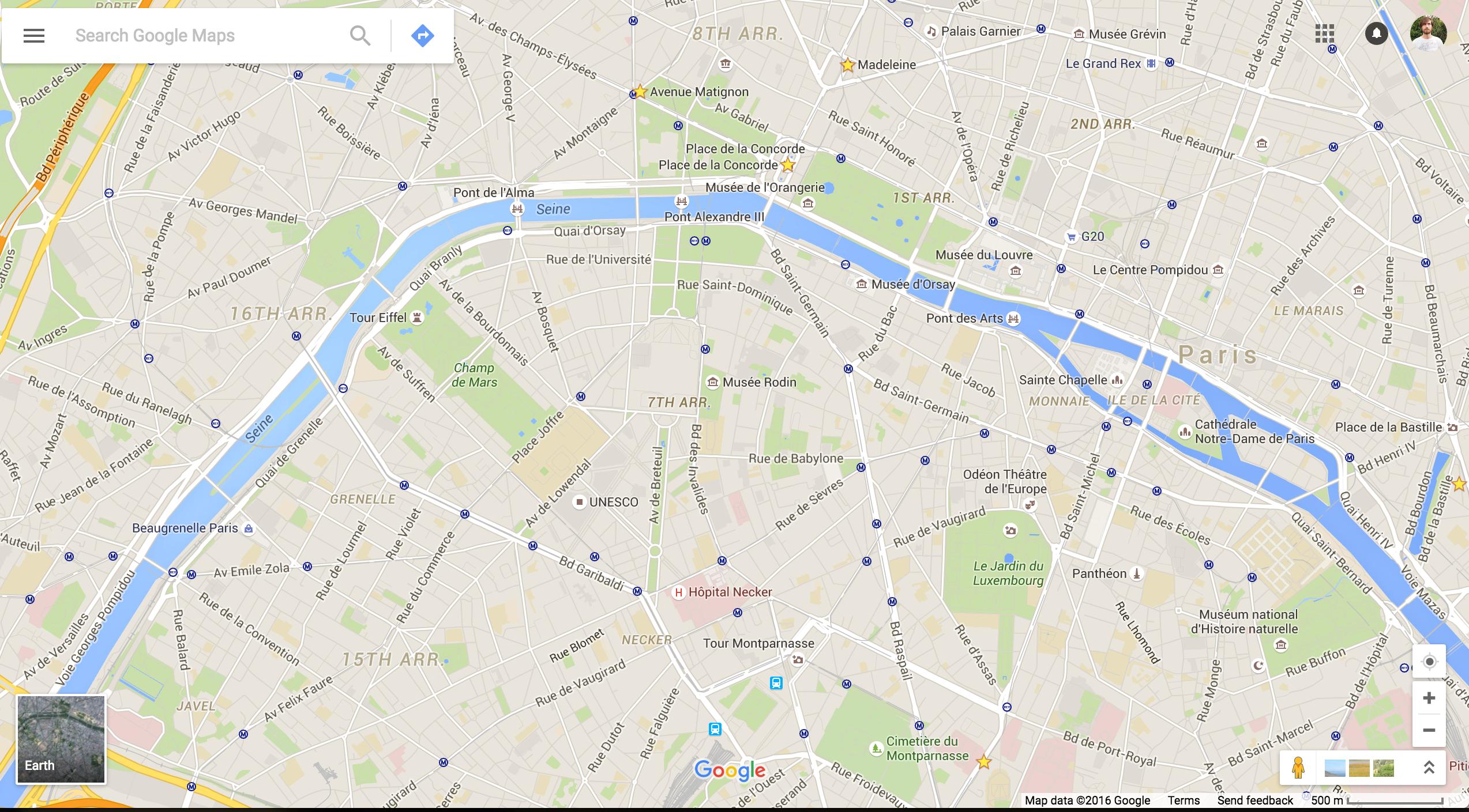 Paris map showing Matignon, Madeleine, Concorde at the top, and Montparnasse far to the south