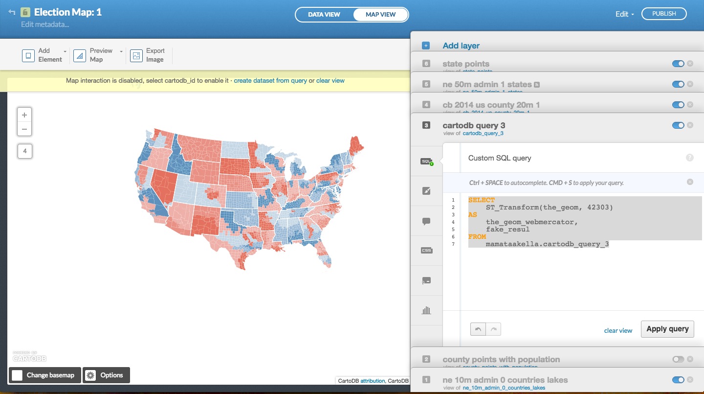 This example uses Election 2012 data for the U.S., table or dataset names and the column names (like romney_percent_num) would change for your dataset.