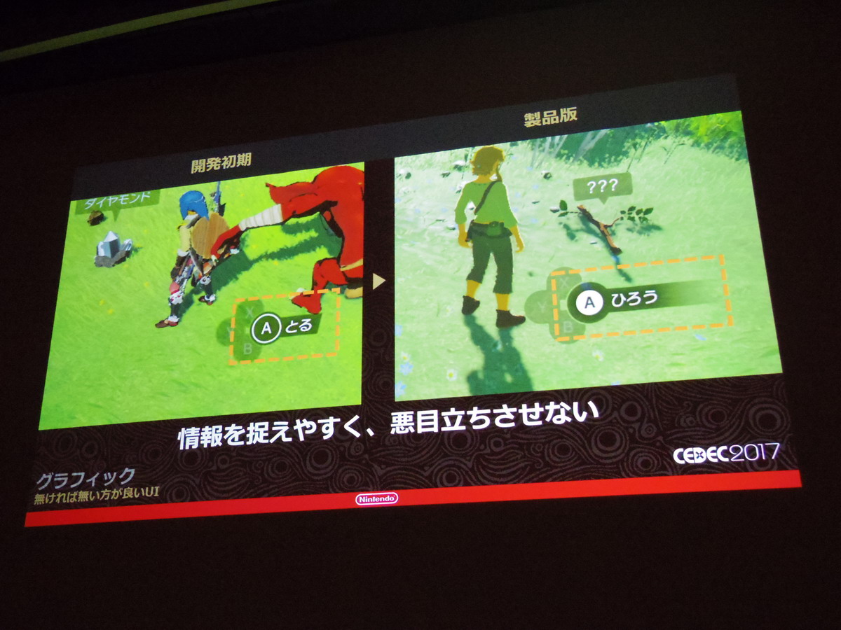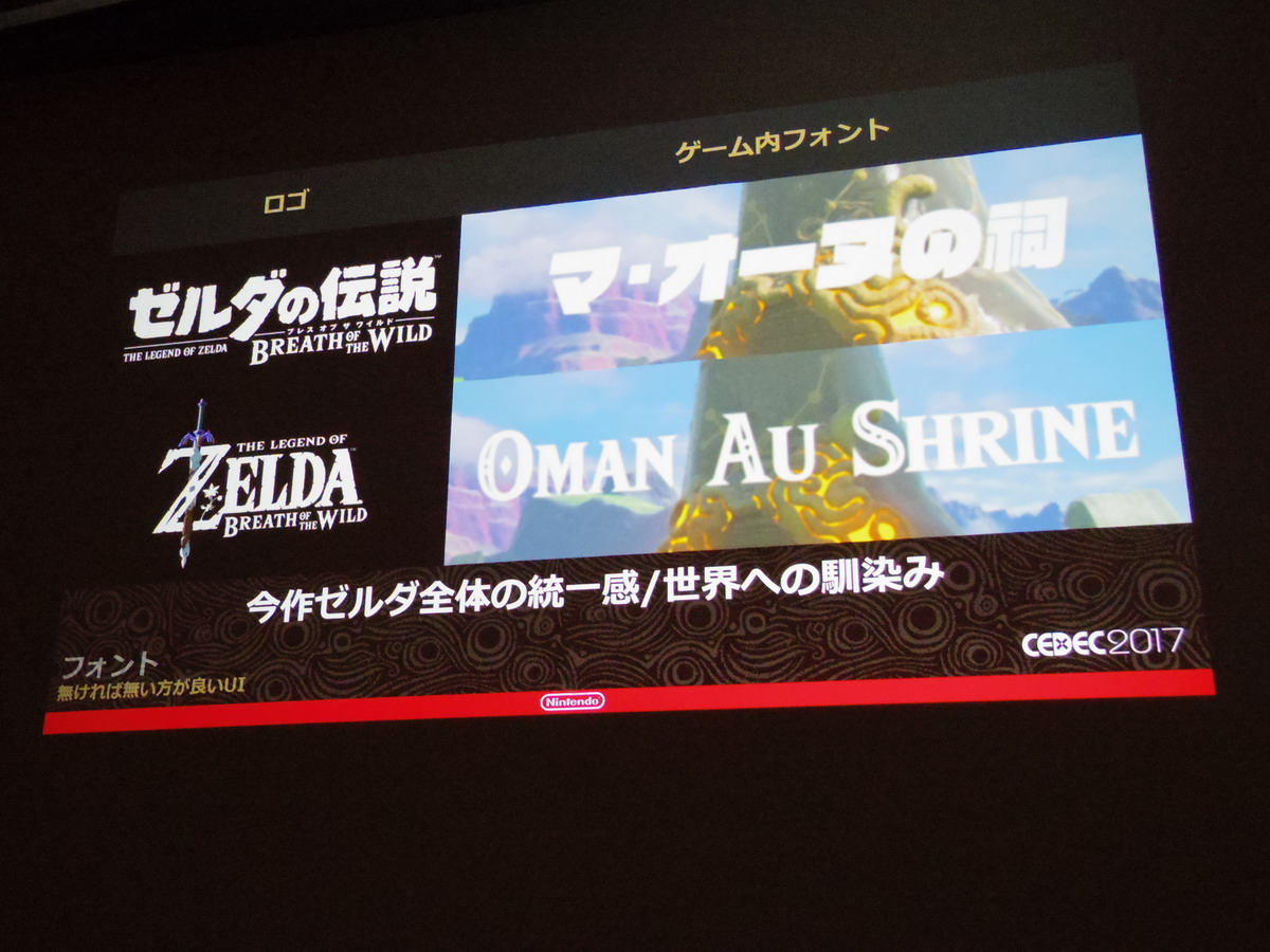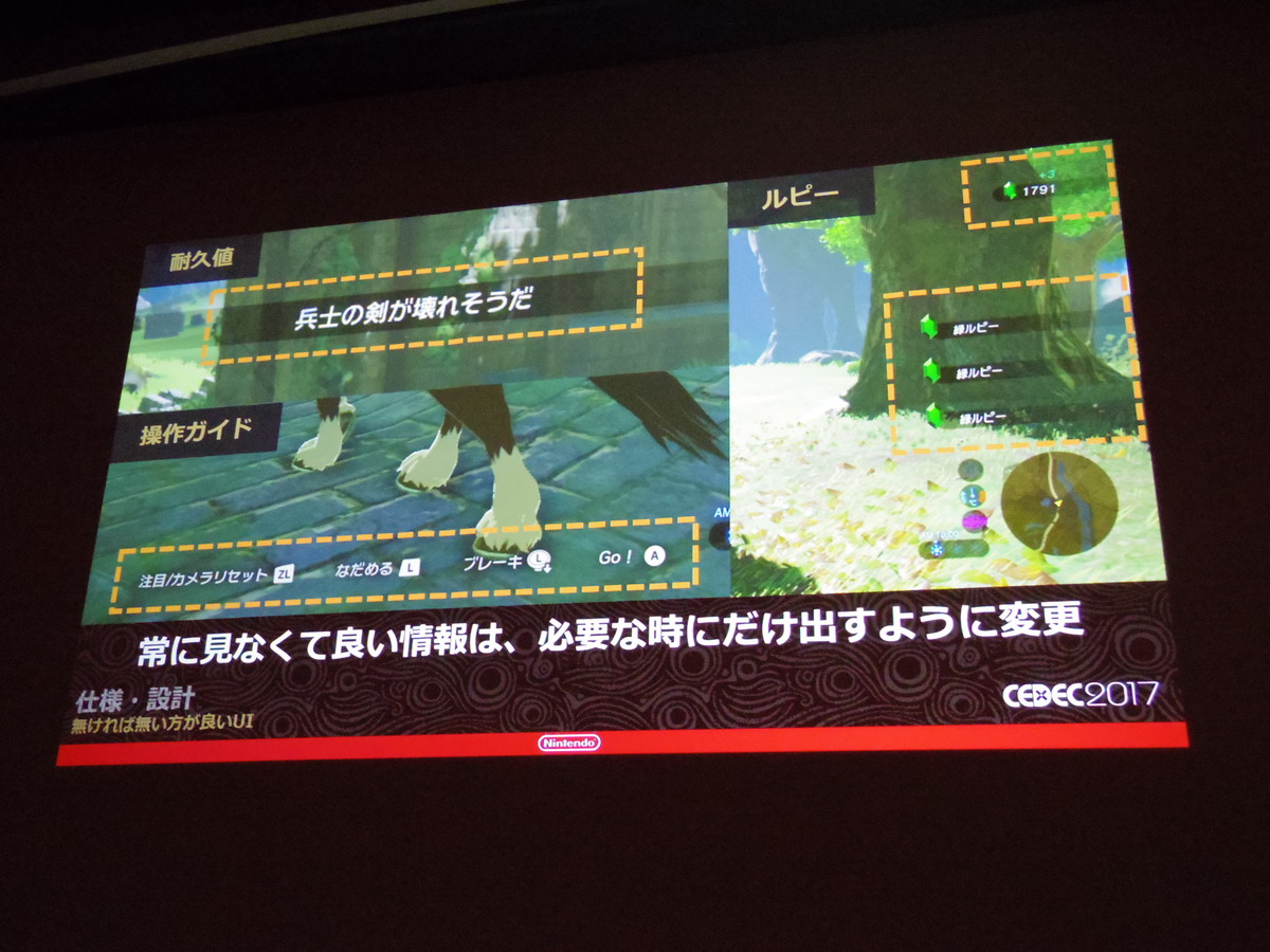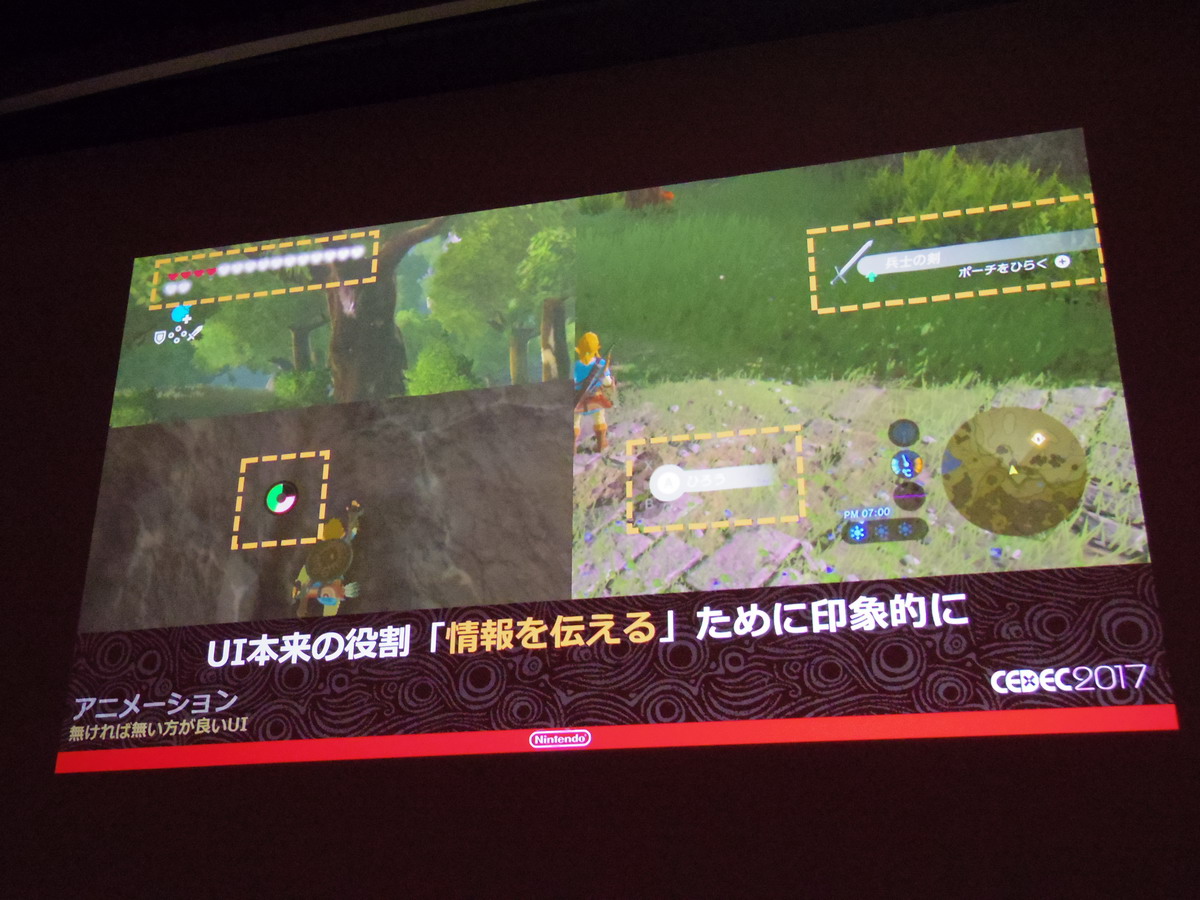 Next up is the talk, “The Aim of BotW’s UI — Immersive, Impressionable UI” (original article here. Being that their aim for BotW was to reconsider Zelda conventions from the ground up, they discussed how they achieved their goal of creating UI that is instantly recognizable as a change, but seamlessly integrates with the game world in 4 categories — graphics, font, design and animation. Their overall concept being, “only essential UI”.)