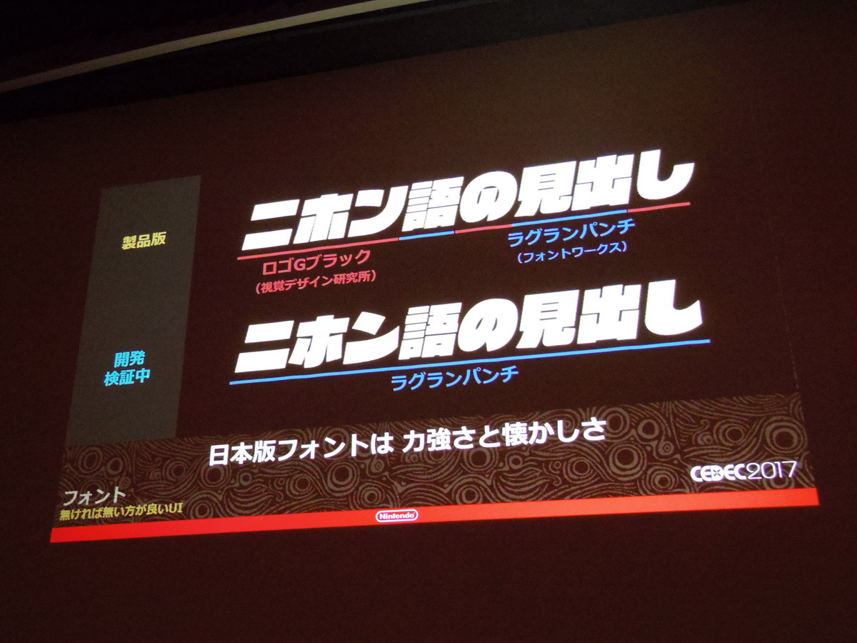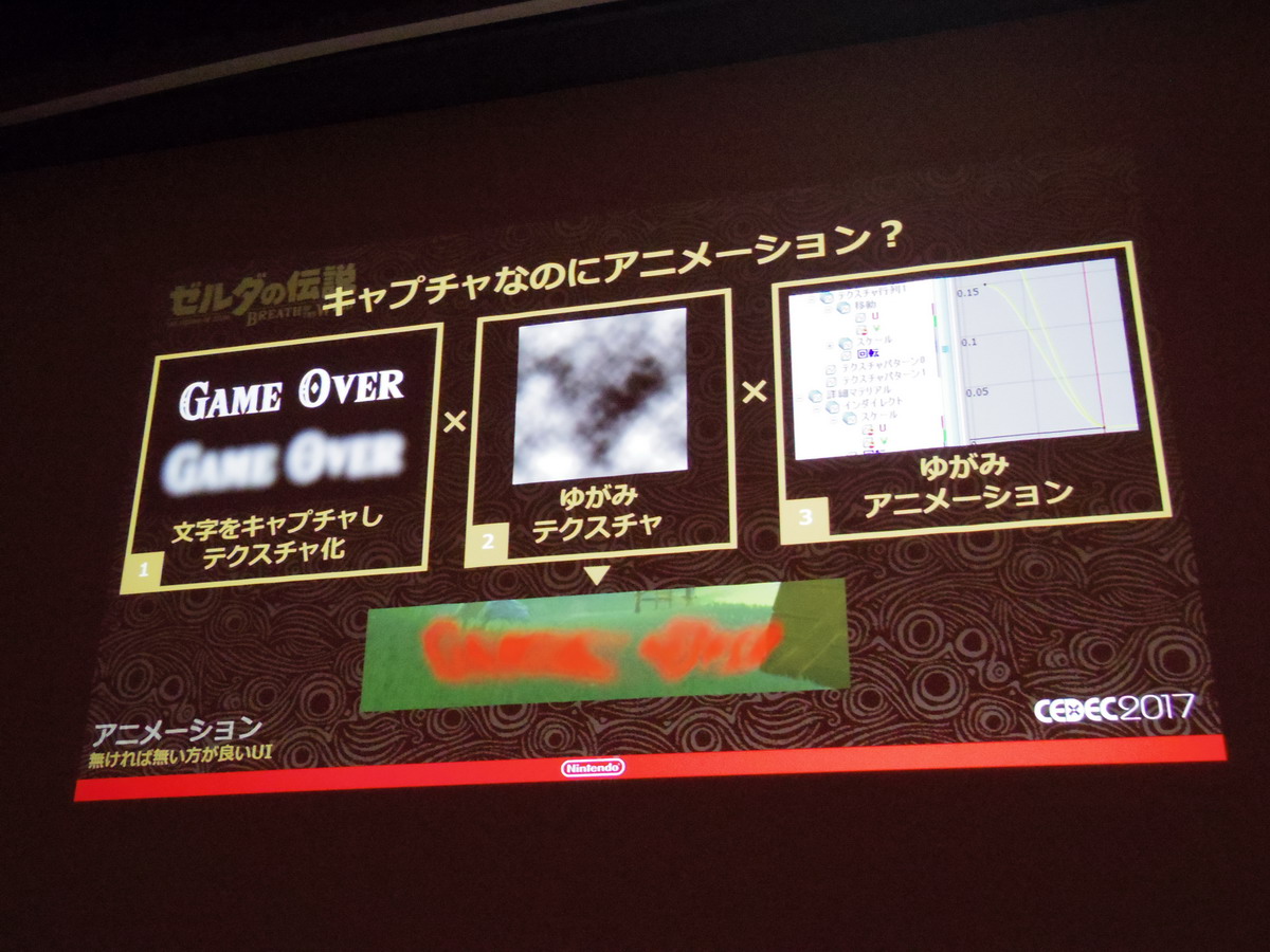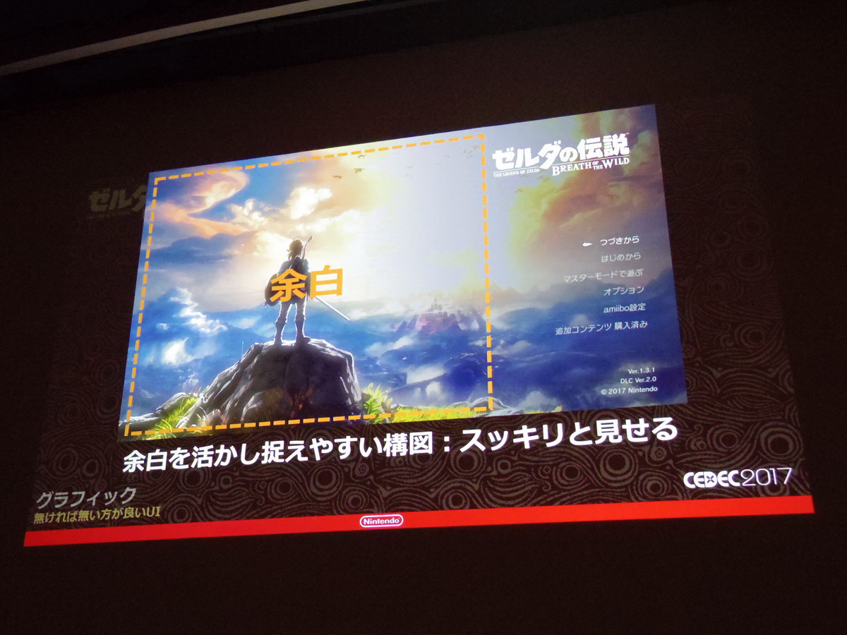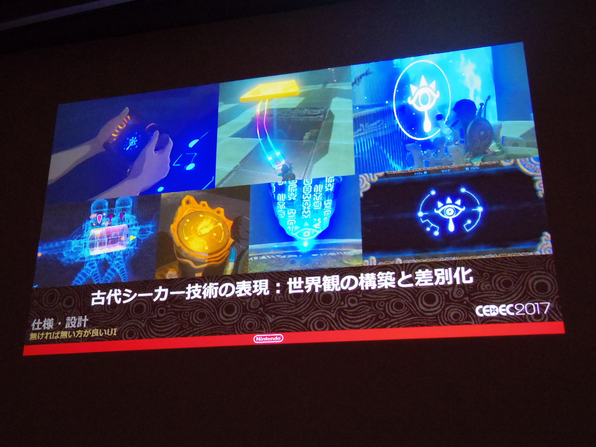 Next up is the talk, “The Aim of BotW’s UI — Immersive, Impressionable UI” (original article here. Being that their aim for BotW was to reconsider Zelda conventions from the ground up, they discussed how they achieved their goal of creating UI that is instantly recognizable as a change, but seamlessly integrates with the game world in 4 categories — graphics, font, design and animation. Their overall concept being, “only essential UI”.)