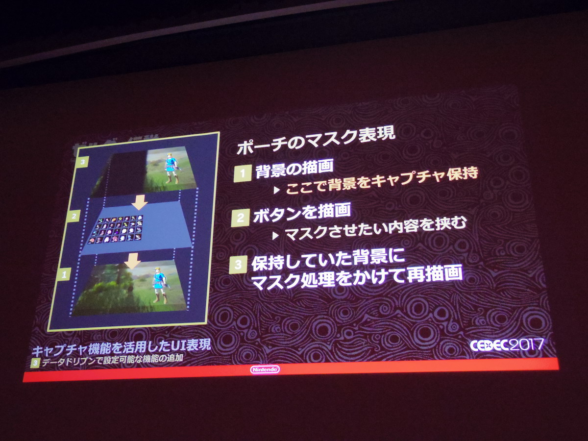 They only had 2 UI designers who wouldn’t be able to handle everything alone, so they worked with the programmers to implement little tricks. Expanding on NCL’s proprietary “LayoutEditor” tool in a “data driven” fashion, allowing designers to place and animate screen nodes, and giving programmers control over them. Up until BotW designers needed programmers in order to implement data into the game, so with BotW it was changed so that the game screens could be previewed on top of each other, over the running game.
