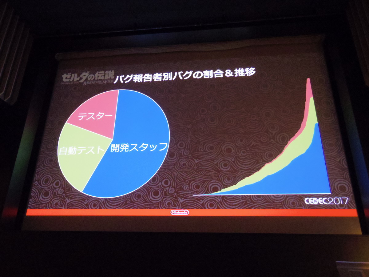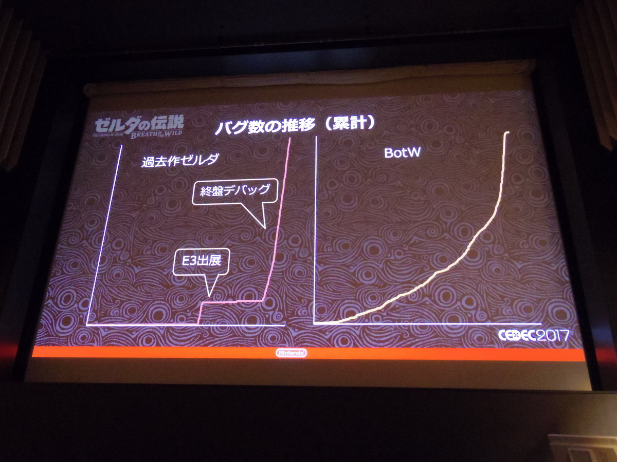 The final two images here are notable — the first showing bug count graphs for comparison. The graph on the left shows the bug count for a past Zelda title (maybe Skyward Sword?), indicating the first spike being the E3 build, and then the second spike being the final debug phase. The graph for BotW is shown on the right.