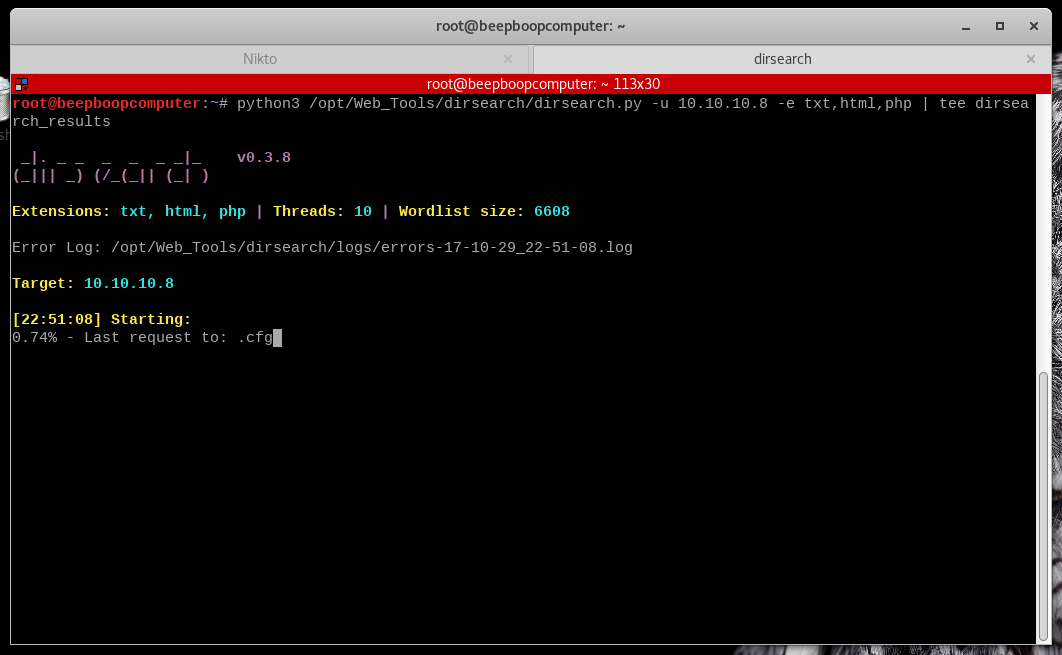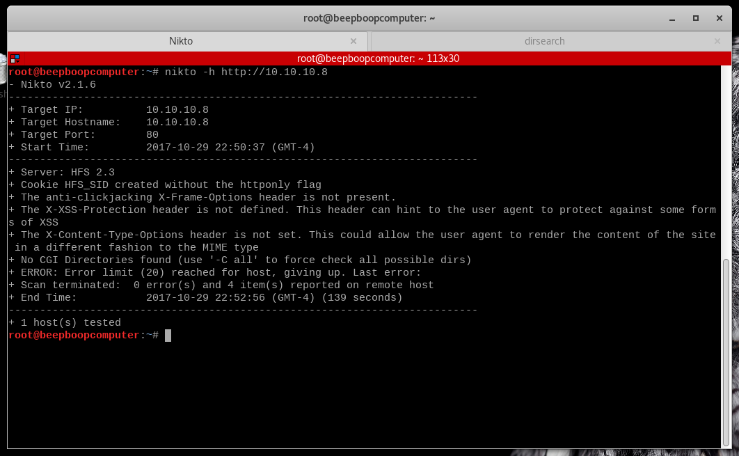 Run nikto -h http://10.10.10.8 and open up a new terminal window or tab for our next tool.