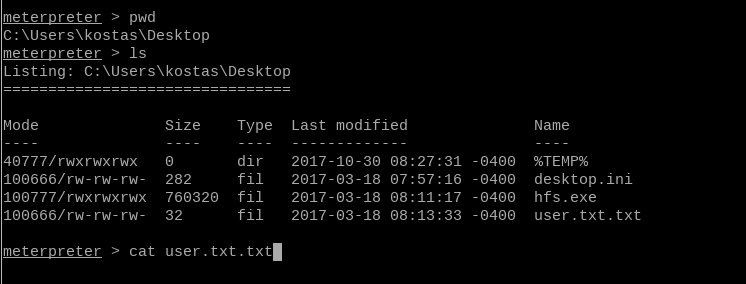 getuidtells what user we are running as. 'kostas' doesn't sound like root.pwdTells us our current working directory - the User's desktop, how convenient.lsShows the files in this directory -user.txt.txtlooks promising.cat user.txt.txtwill output the contents of the user flag file to the screen. Copy them down and submit them on HackTheBox!