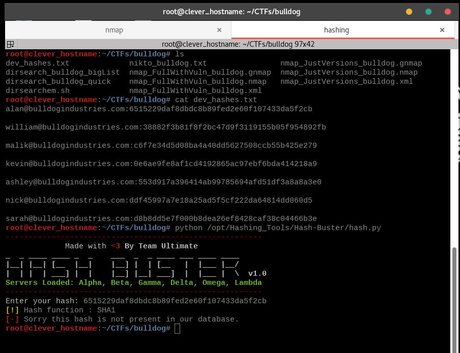 Okay, we have SHA1, but it didn’t crack. Luckily, we have many hashes to choose from. We can try them all. For best results, let’s run them through John the Ripper and then check them in HashBuster while that is running.