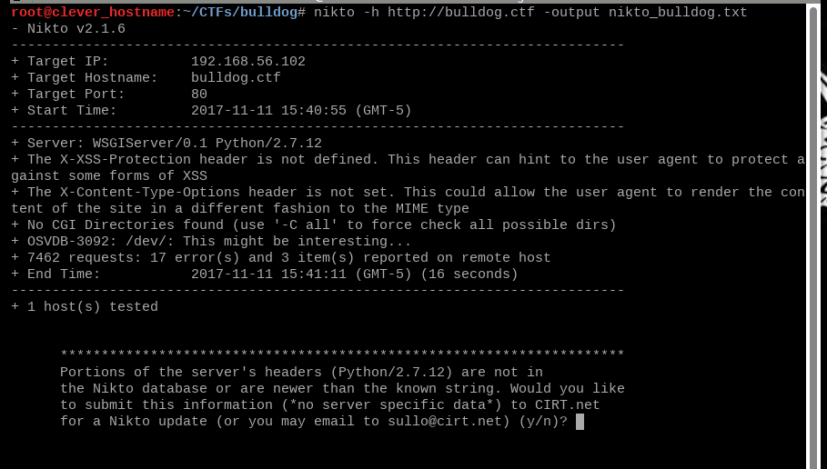 nikto -h http://bulldog.ctf -output nikto_bulldog.txt