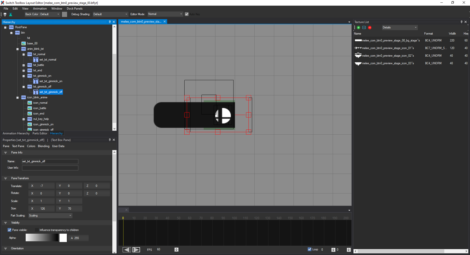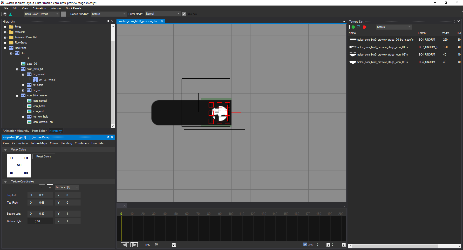 Open the file named melee_com_btn0_preview_stage_00.bflyt in the layout listing. Once it's opened in the layout editor, it should look like this: