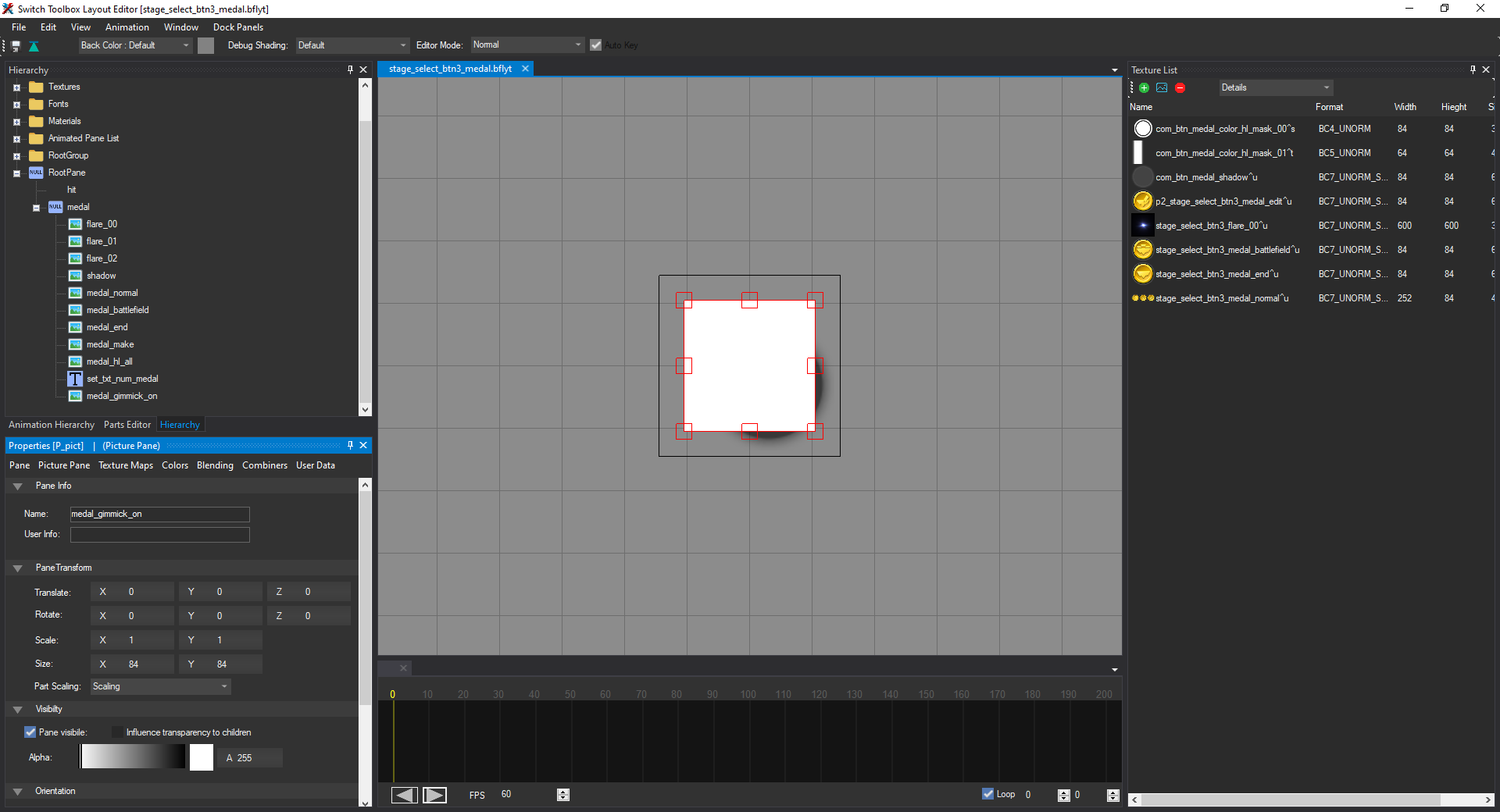 In order to fix this, we need to go to the Hierarchy tab on the left side of the window. It should display a list of expandable sections. We want to expand RootPane, then medal. You'll see a list of panes with names like flare_00, medal_normal, medal_battlefield, shadow, etc. (not in that order). Your window should now look like this: