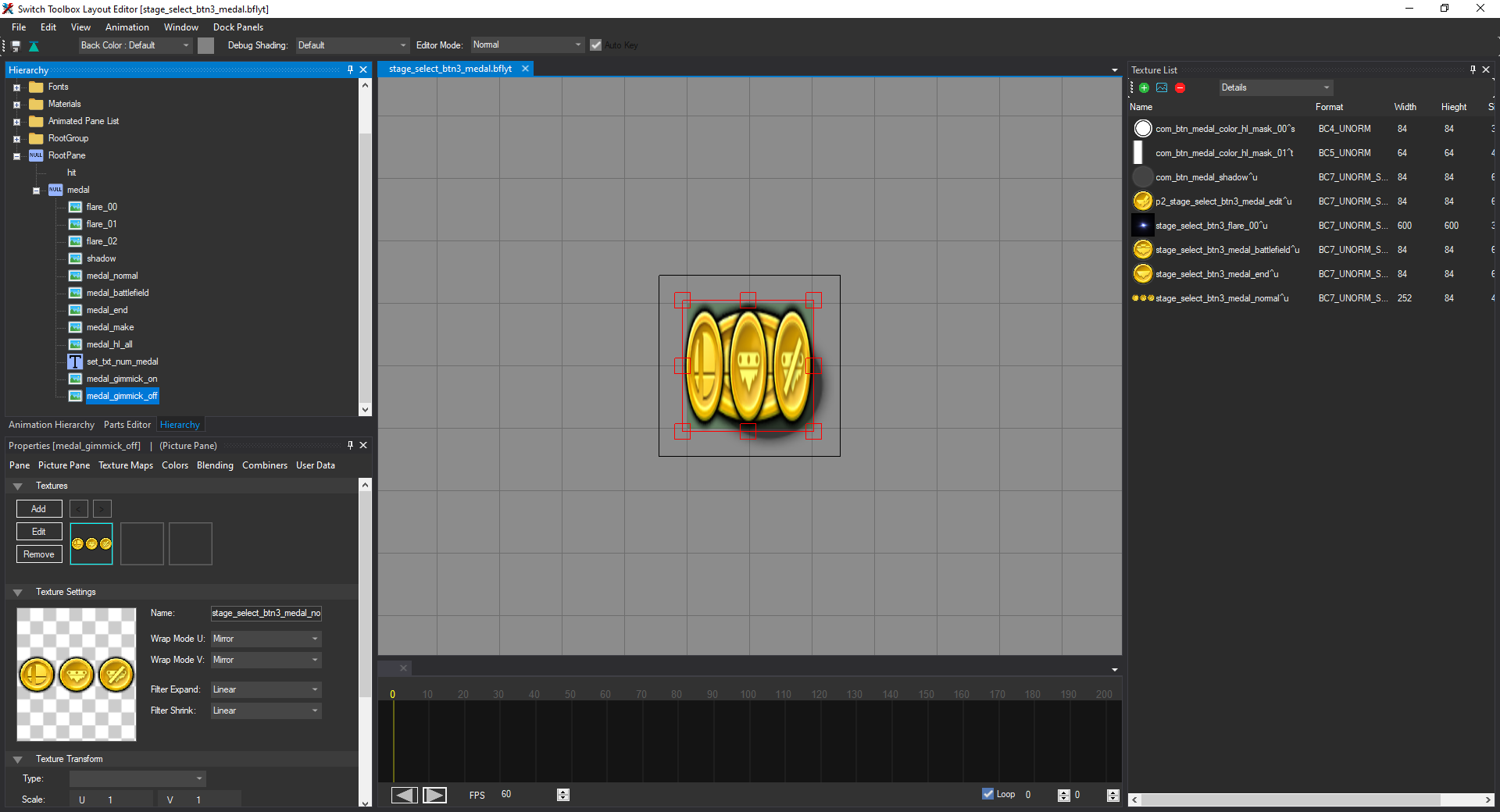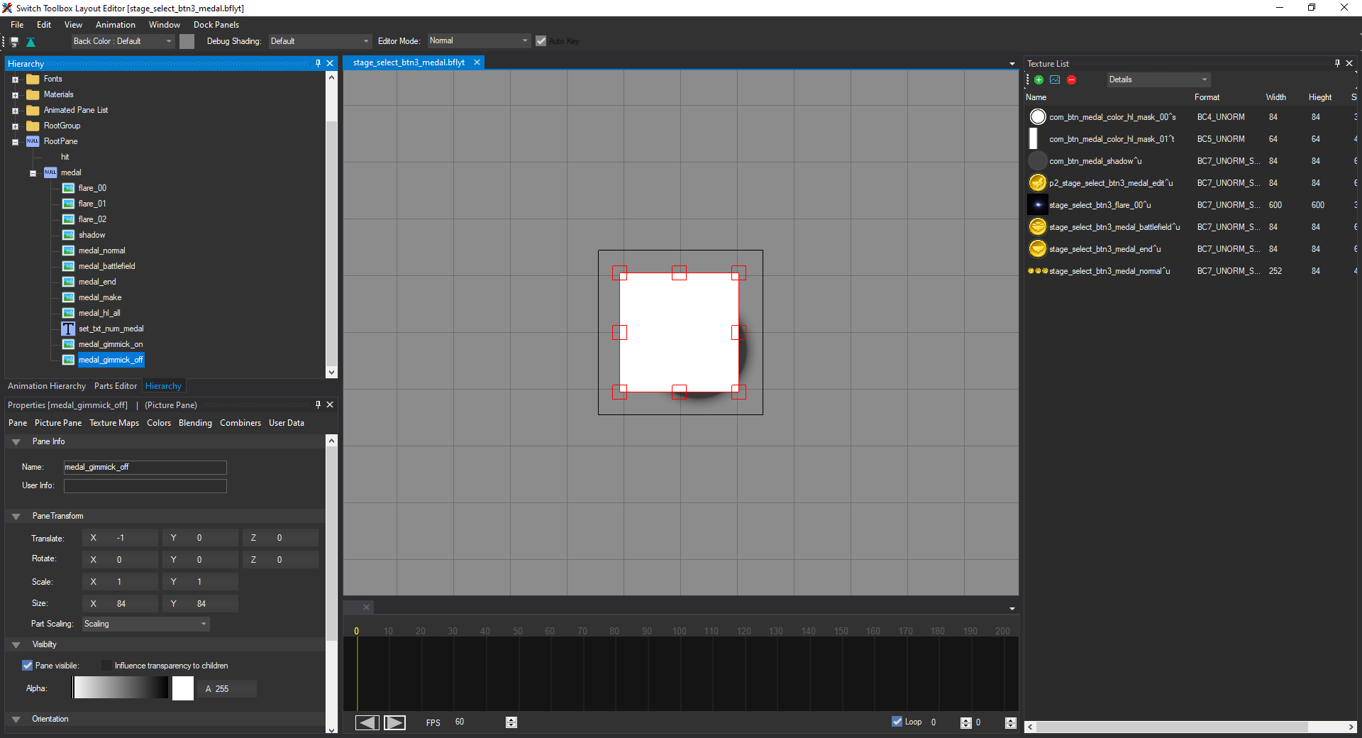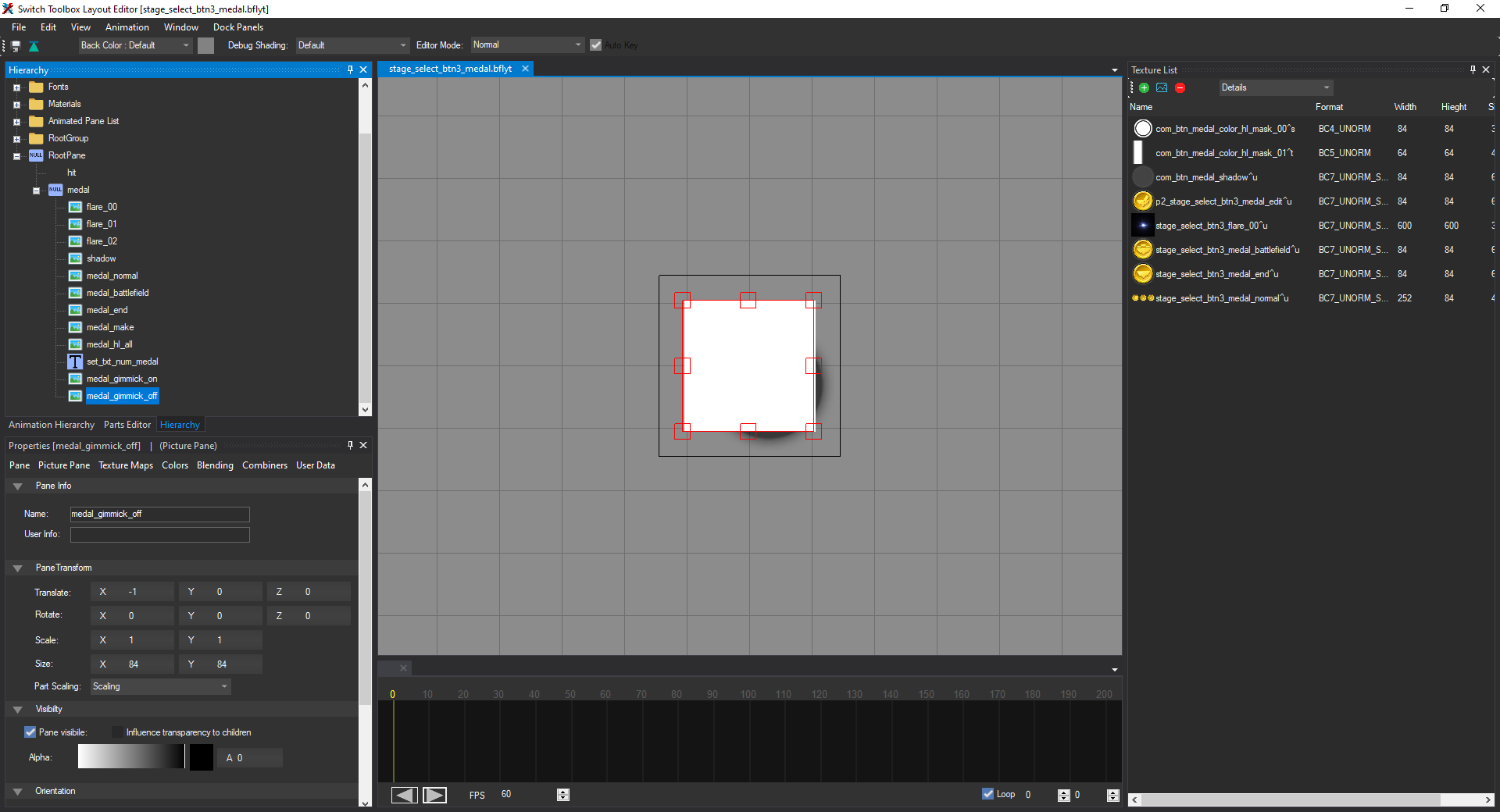 Once you are done, set the Alpha of both medal_gimmick_on and medal_gimmick_off to 0, and then click the Save icon in the top left to save the layout. Then close the window so you are back in STB's main listing.