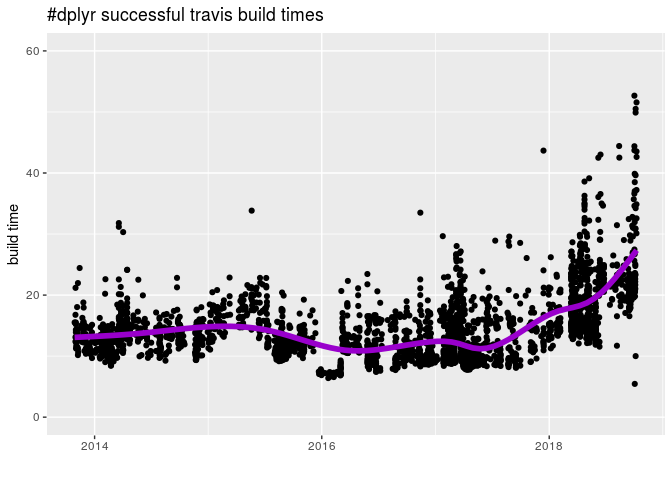 labs( title = "#dplyr successful travis build times" ) +