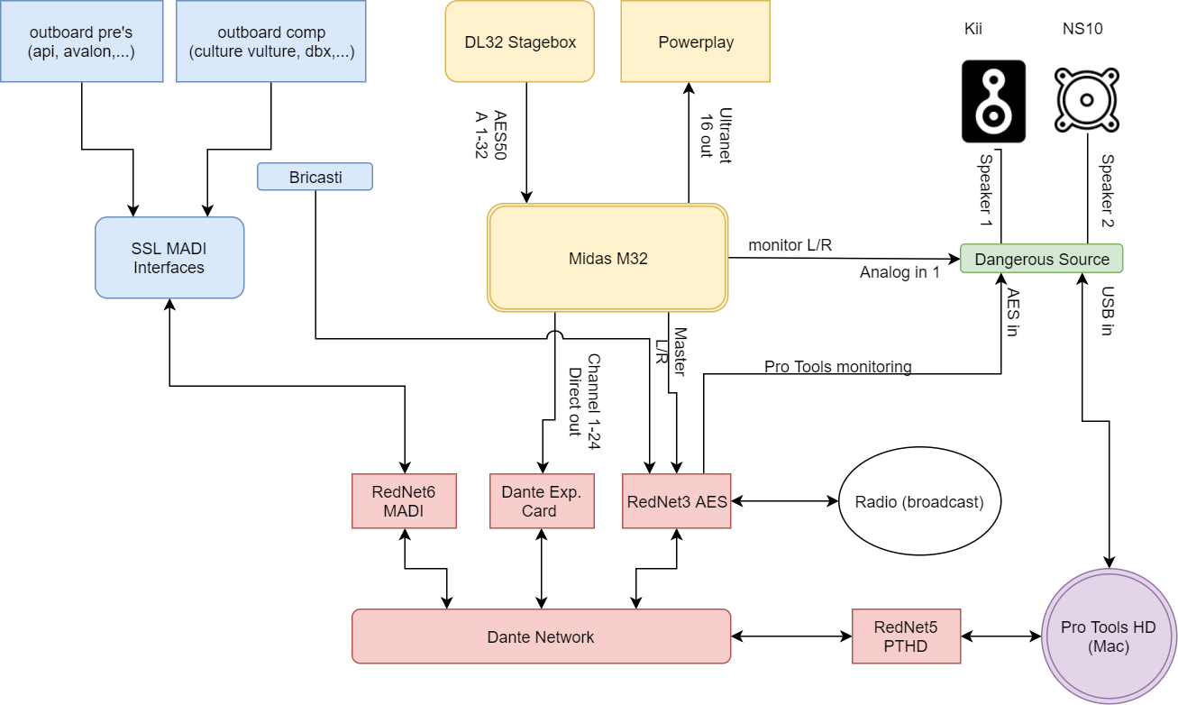 - 13/14 is [direct out channel 31/32] ->stuurt radio L/R naar pro tools