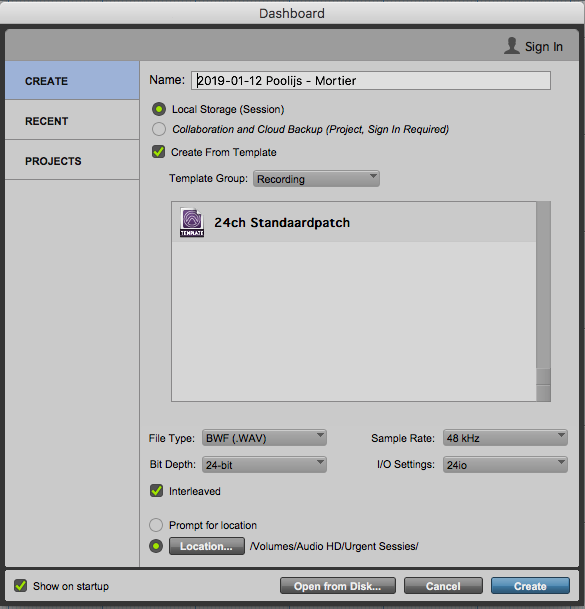 24ch Midas Recording preset - maak een nieuw project in Pro Tools: $
