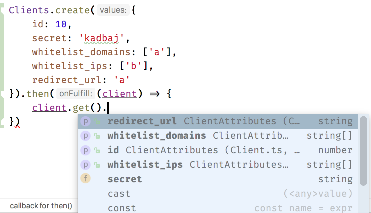 When dealing with 15-20 models in your project (usual mid-size node/express projects get there pretty fast), you'd want a little more strictness around your models' keys and better autocomplete would always be welcome.