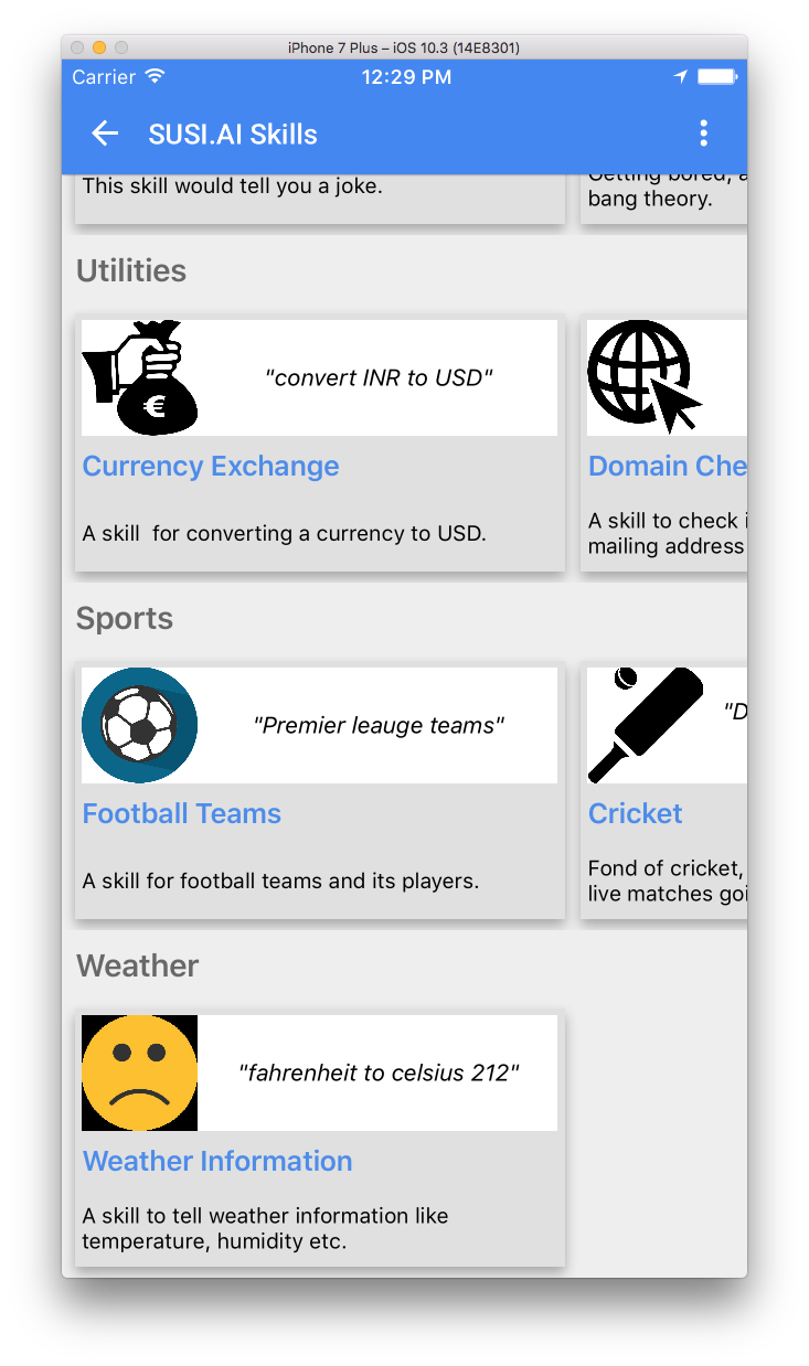 The main aim of this project was to develop an iOS app on top of the SUSI.AI Server functionalities. The server makes use of different skills which are defined in the Skill Data Repository. The app will have functionalities such as replying intelligently to user's queries, helping users in their day to day lives, hot word detection, and training, synchronizing settings across all the clients and much more.