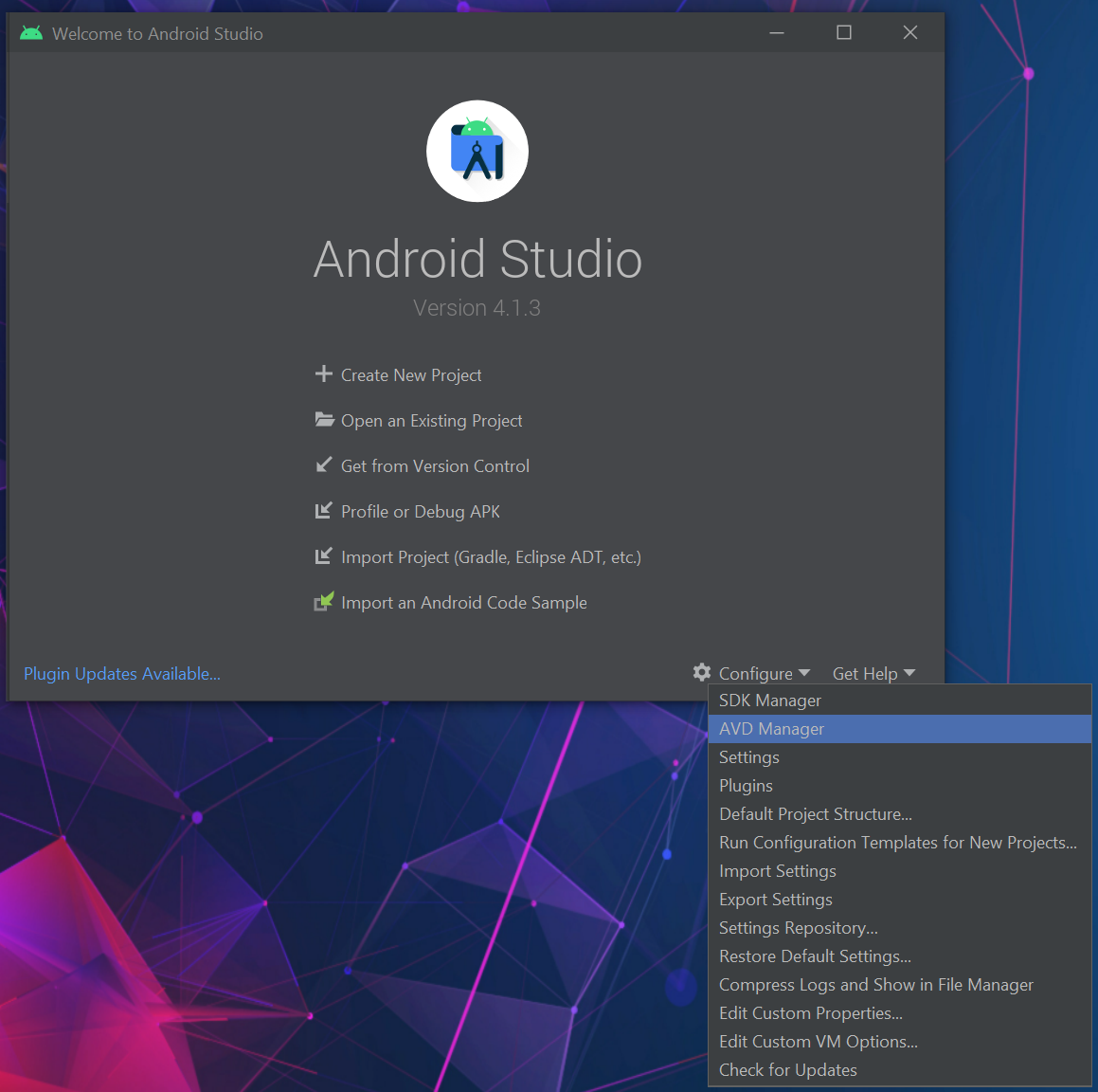 Create a virtual device (e.g. Nexus_5X_API_29) in windows with Android Virtual Device Manager from Android Studio.