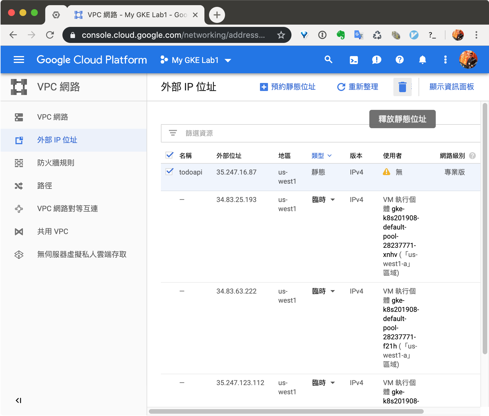 # reserve a new static external IP address for backend todoapi % gcloud compute addresses create todoapi --region=us-west1 --network-tier=PREMIUM # make sure the static external IP address has been allocated % gcloud compute addresses listPlease remember
