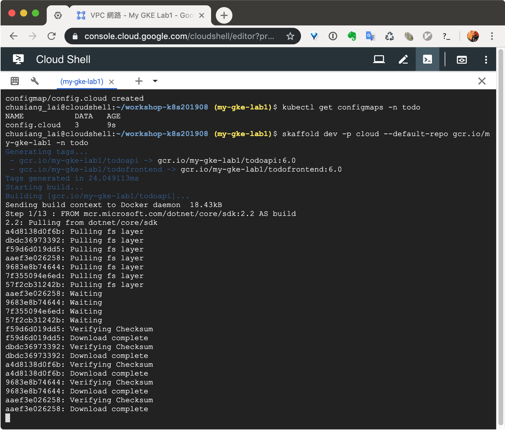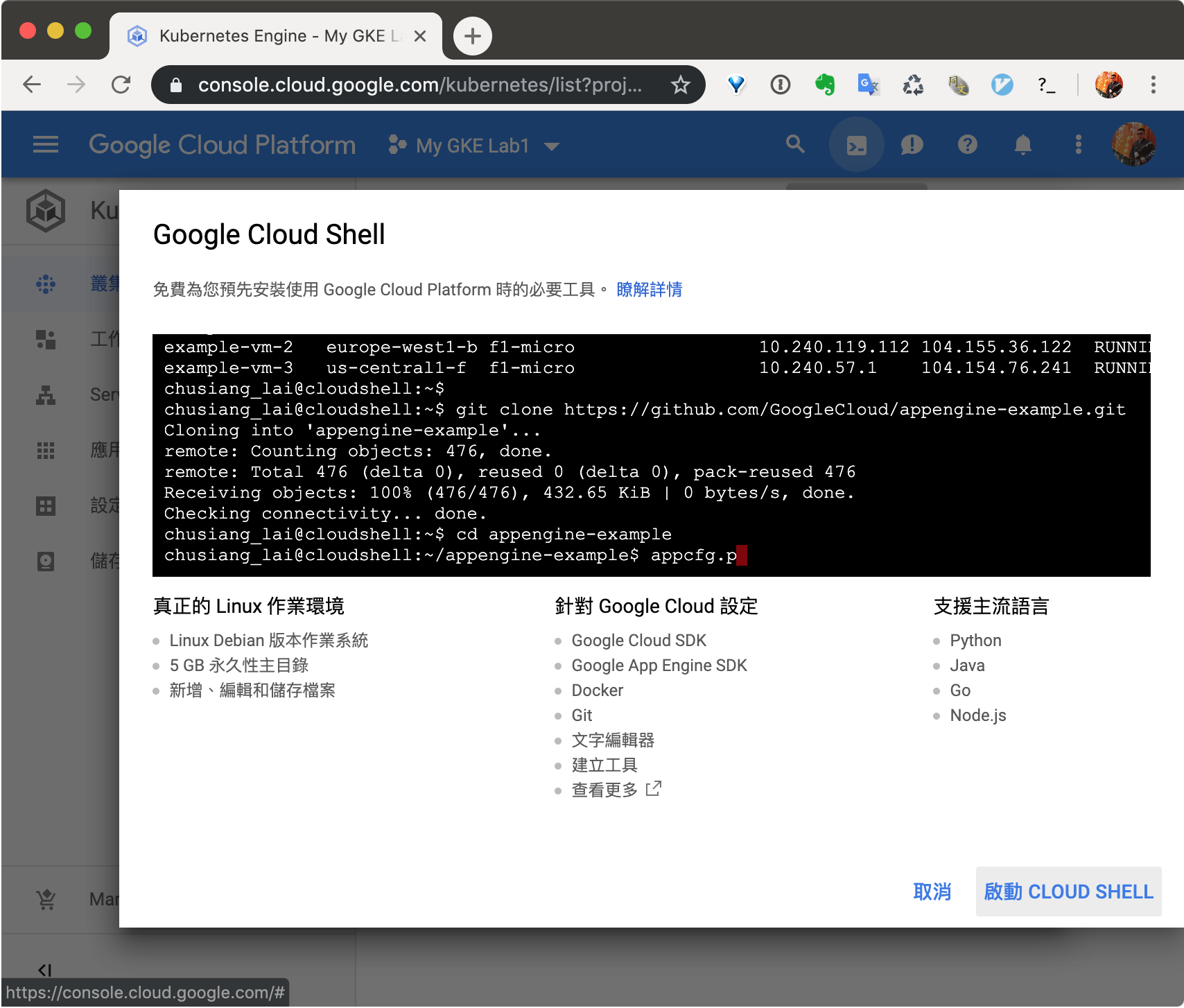 回到 GCP 的 Cloud Shell 界面觀看 GKE Setup 的結果。